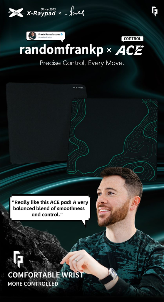 Frank Passalacqua chia sẻ: “Mình thật sự thích tấm pad ACE này! Sự kết hợp rất cân bằng giữa độ mượt và kiểm soát.”