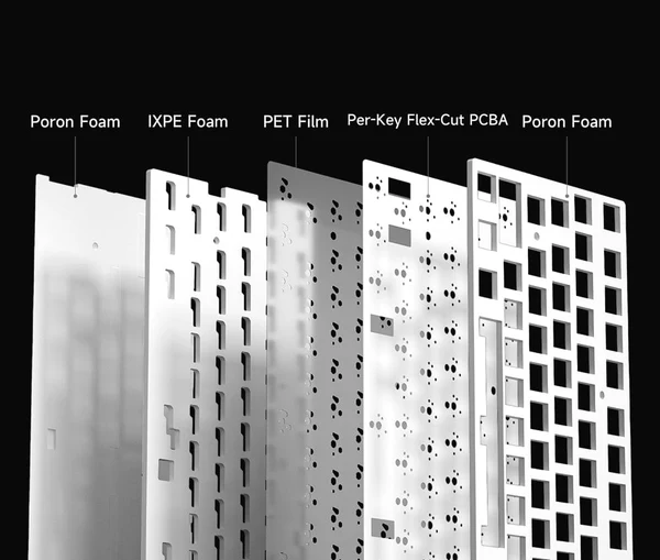Cấu trúc gasket kết hợp 5 lớp đệm tiêu âm và hấp thụ lực giúp mang lại cảm giác gõ êm ái, giảm tiếng ồn và tăng độ ổn định. Bàn phím được thiết kế để người dùng có thể dễ dàng tháo lắp và tùy chỉnh từng thành phần theo sở thích cá nhân.
