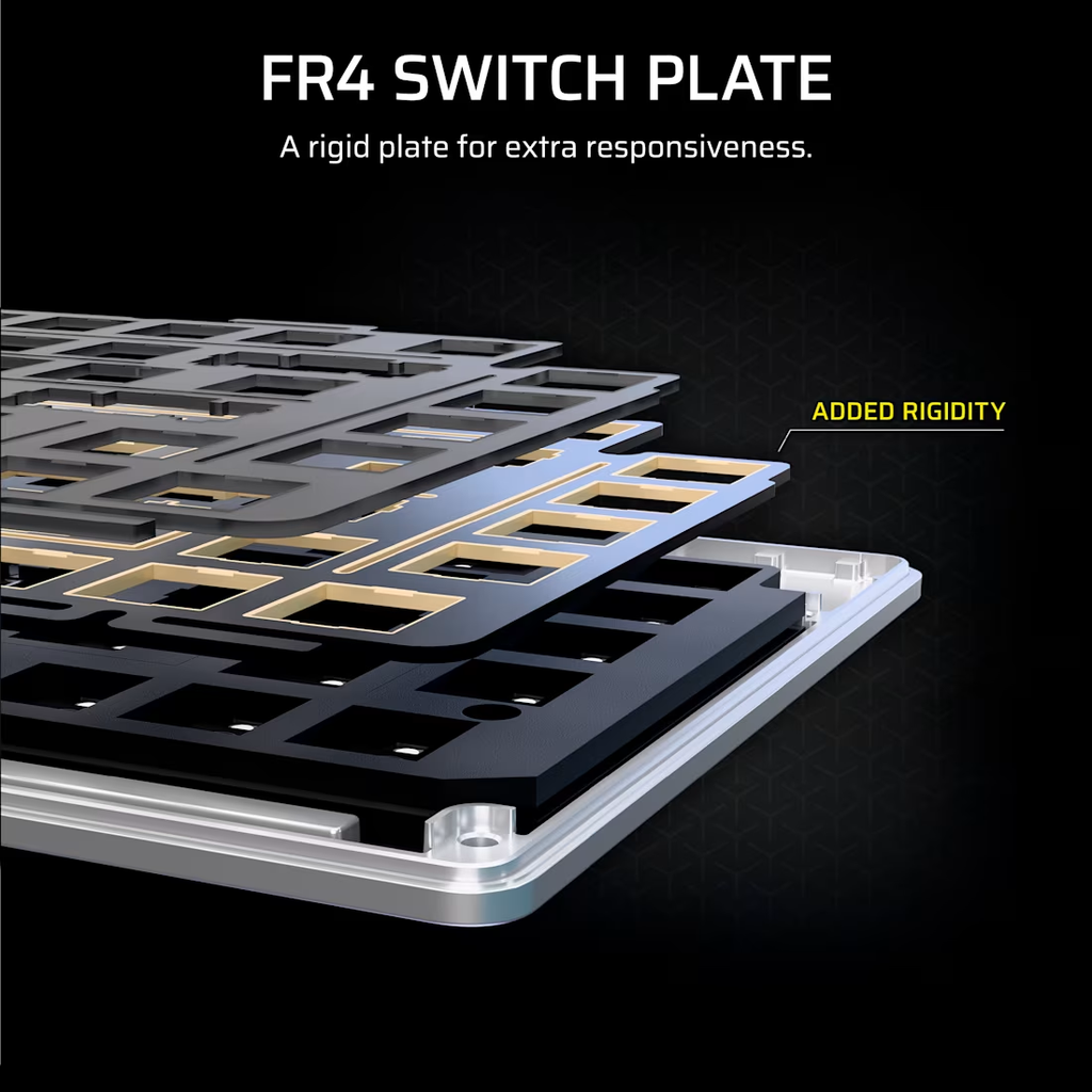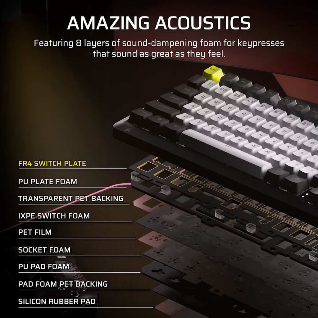 Corsair MAKR PRO 75 được thiết kế theo cấu trúc gasket mount cùng nhiều lớp tiêu âm, giúp giảm rung và tiếng ồn khi gõ. Kết hợp với plate FR4, bàn phím mang lại cảm giác gõ chắc tay, đồng đều và âm thanh dễ chịu, phù hợp cho cả chơi game lẫn gõ văn bản dài.