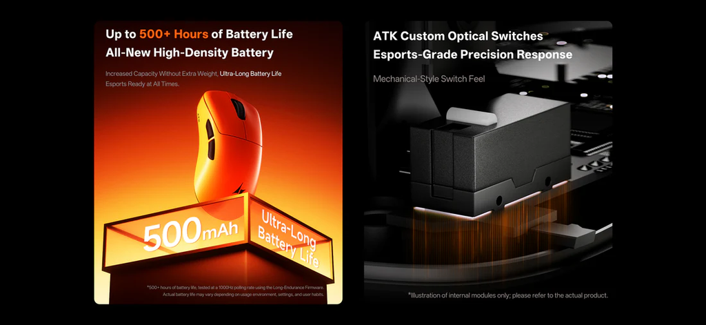 Chuột được trang bị pin dung lượng 500mAh mật độ cao, mang lại thời gian sử dụng dài hơn mà vẫn giữ trọng lượng nhẹ.