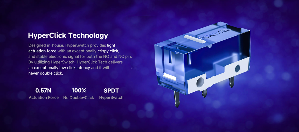 Switch cho cảm giác nhấn rõ ràng, độ nảy tốt, phù hợp cho click spam và thao tác liên tục. Chân chuột PTFE cao cấp giúp di chuyển mượt mà, ổn định trên nhiều loại mousepad khác nhau.