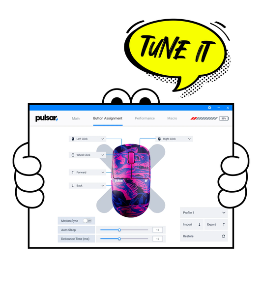 X2 CrazyLight hỗ trợ phần mềm Pulsar Fusion, cho phép người dùng dễ dàng tùy chỉnh DPI với bước nhảy 10 đơn vị, thiết lập chức năng các phím, điều chỉnh tần số quét và bật/tắt công nghệ Motion Sync giúp đồng bộ hóa tín hiệu cảm biến với máy tính, giảm độ trễ xuống dưới 1ms.