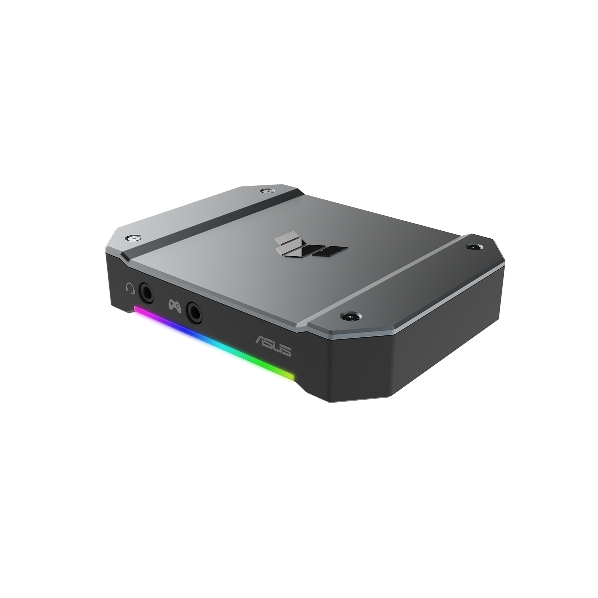 Mặt trước của ASUS TUF Gaming Capture Box được chiếu sáng bằng dải đèn RGB cho biết trạng thái chức năng một cách thuận tiện (Mỗi trạng thái một hiệu ứng ánh sáng).